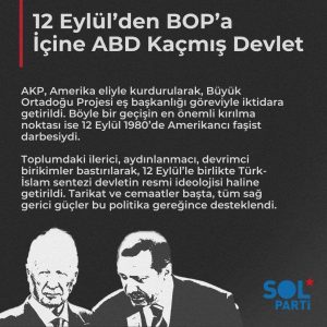 AKP’nin 12 Eylül zihniyetinin doğrudan sonucu olduğunun altını çizen SOL Parti, “Bugün mafyaların, tarikatların ve tüm sömürücü zorbaların altında birleştiği tek adam rejimi 12 Eylül’ün güncel görünümüdür. Ülkemizin Amerikancı siyasal İslam hakimiyeti altına sokulmasında, önemli bir başka eşik de ikinci 12 Eylül, 12 Eylül 2010 referandumu oldu. Siyasal İslamcı faşist güçler 2010 referandumu ile devleti ele geçirerek, tek adam rejimine uzanacak bir gücü elde ederek bugünlere geldiler” dedi.